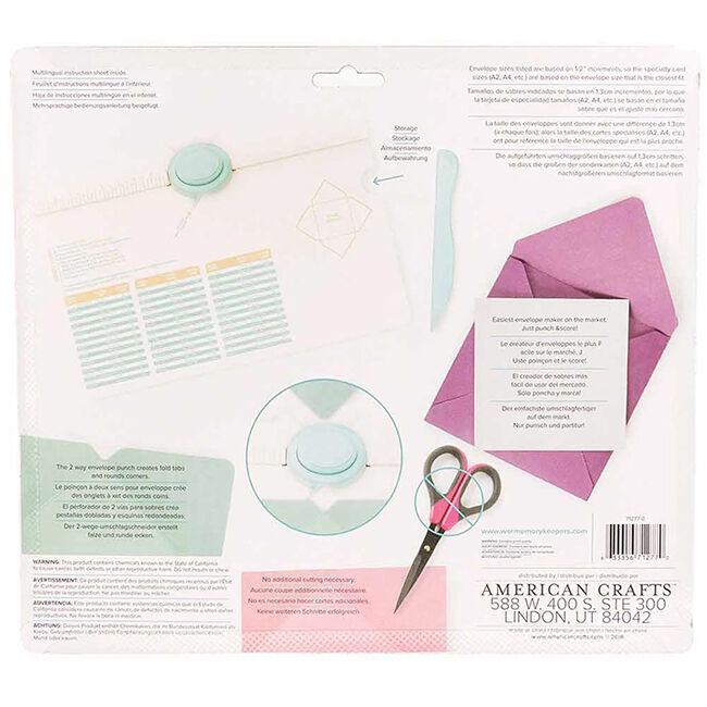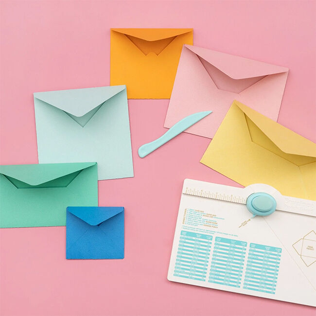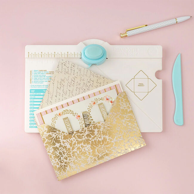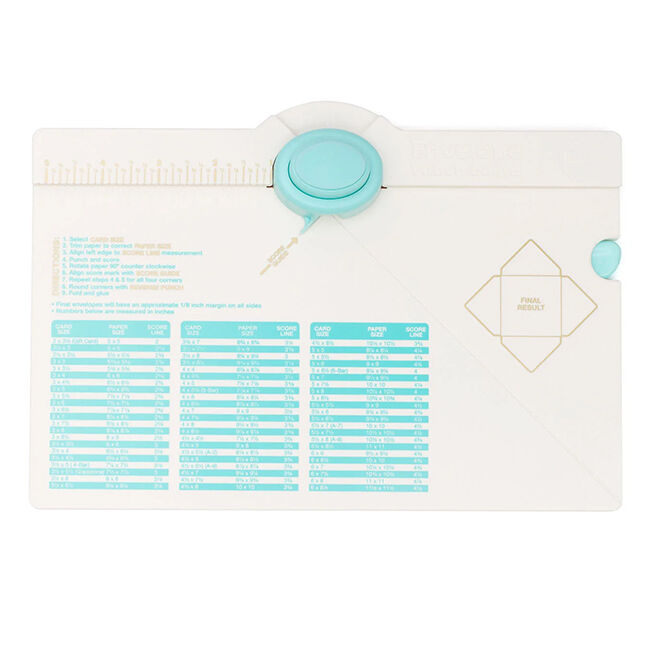Alustalla saat tehtyä kymmeniä eri kokoisia kirjekuoria! Pakkaus sisältää nuuttausalustan, taittoluun jolla oma säilytyslokero alustassa, mittataulukon, leikkurin joka pyöristää kulmat ja taittaa kielekkeen. Alustassa on mittaviivasto tuumissa ja senteissä.