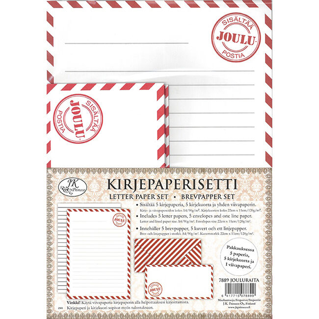 Kirjepaperisetti kirjeiden kirjoittamiseen. Pakkaus sisältää viisi kappaletta A4-kokoisia kuvioituja kirjepapereita, viivapaperin sekä viisi kappaletta pitkiä kuvioituja kirjekuoria.