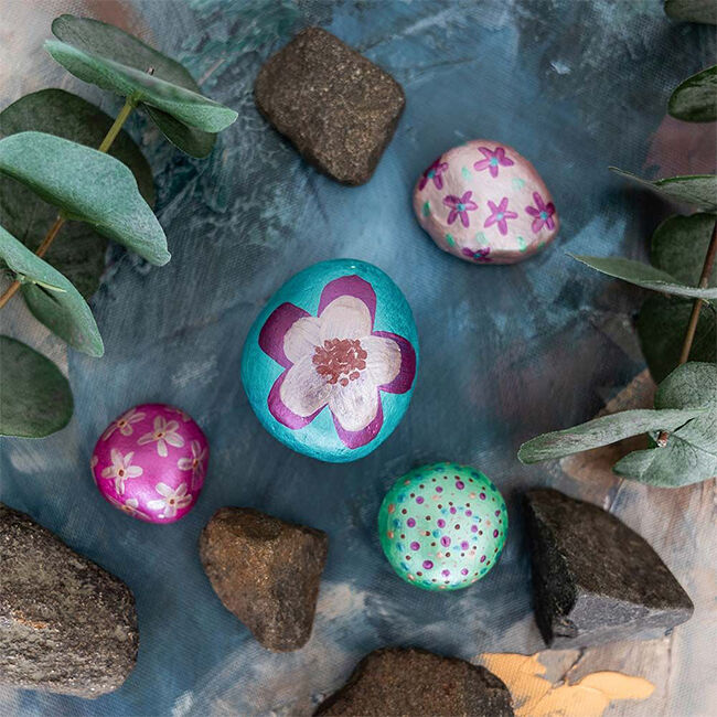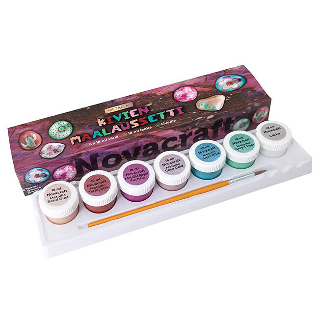 Täydellinen setti kivien maalaukseen. Pakkaus sisältää 6 x 18 ml metallinhohtoista akryylimaalia, 18 ml lakan ja yhden siveltimen.