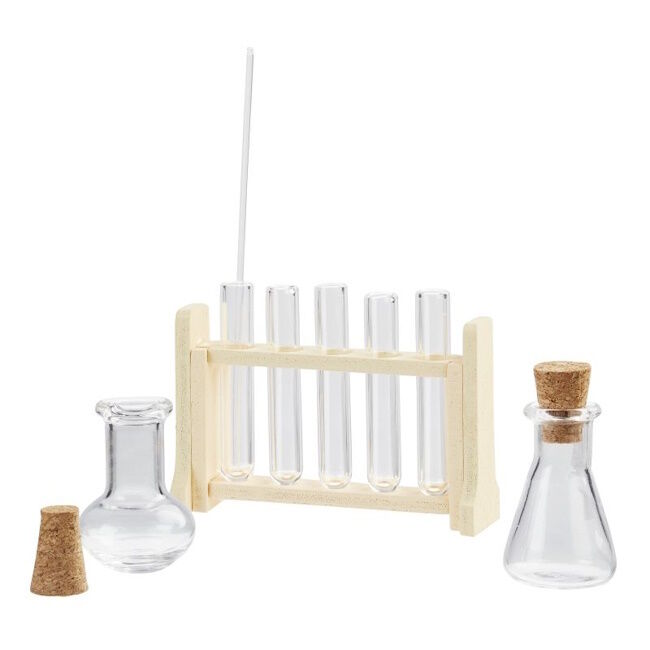 Miniatyyri koeputkisetti. Koko noin 4,5 x 3 cm. Setissä 9 osaa.