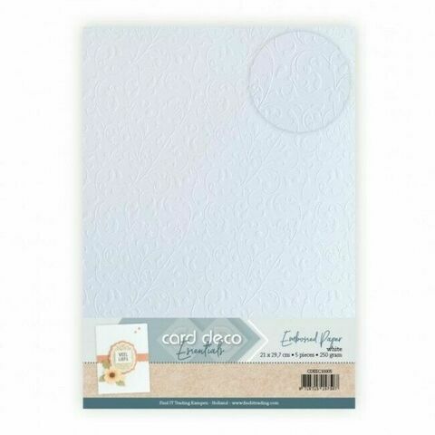 250 g/m²:n painollaan paperi on vahvaa ja kestävää, joten se sopii täydellisesti korttien valmistukseen, scrapbookingiin, kutsuihin ja muihin luoviin käyttötarkoituksiin. A4-koko (21 x 29,7 cm) tarjoaa runsaasti tilaa monenlaisille malleille, ja jokainen pakkaus sisältää 5 arkkia ajatonta valkoista kohokuviopaperia.