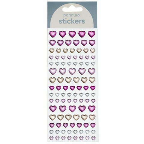 Hohtavia ja kimaltelevia pehmotarroja, joissa on paljon sydämiä, neljässä eri koossa. Sydämien leveys vaihtelee 6–12 mm:n välillä. Kaikki sydämet ovat noin 1 mm paksuja. Tarrat on kiinnitetty muovilevyyn, jonka koko on 7,5 × 17 cm.