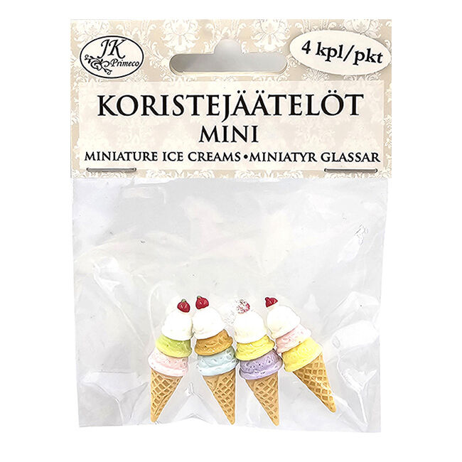 Koristejäätelöt koristeluun ja minimaailman rakentamiseen. Pakkaus sisältää neljä kappaletta muovisia jäätelötuutteja.