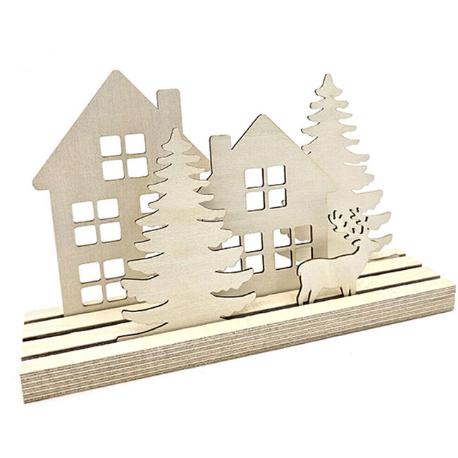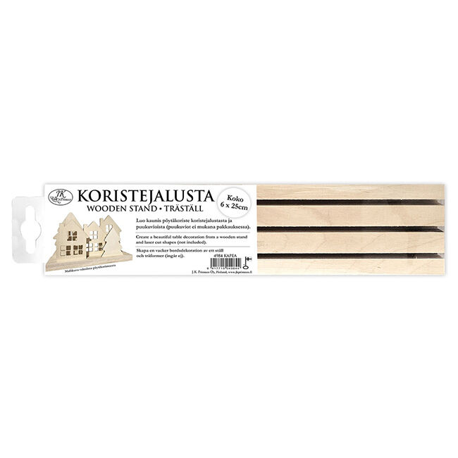 Koristejalusta askarteluun. Luo puukuvioista näyttävä pöytäkoriste! Aseta puukuviot uriin ja koristele mieleiseksi esimerkiksi valoilla tai muilla koristeilla. Pakkaus sisältää yhden puujalustan, jossa on kolme uraa. Jalusta sopii puukuvioille, joiden paksuus on enintään 3 mm. Aseta puukuviot jalustan uriin ja käytä kiinnittämiseen tarvittaessa liimaa (suosittelemme tähän pikaliimaa tai kuumaliimaa). Kotimainen tuote. Huom! Jos poltat kynttilää, niin käytäthän palamatonta alustaa kynttilän alla.