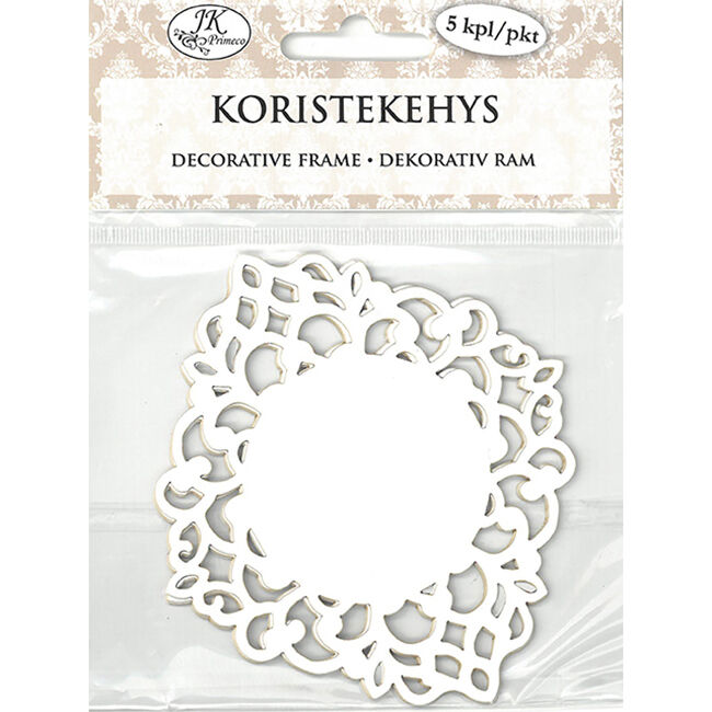 Koristekehykset askarteluun ja koristeluun. Pakkaus sisältää viisi kappaletta kartonkisia kehyksiä, joissa on laserleikattu kuviointi.