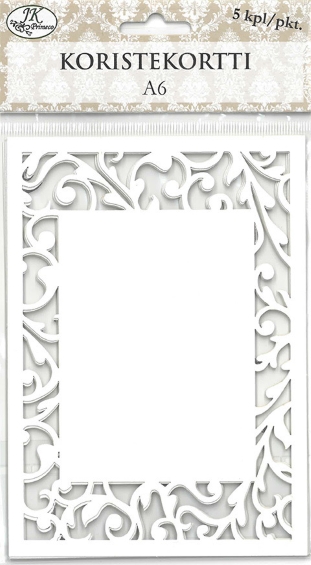Koristekortti Amanda laserleikatulla kuviolla. Koristekortti sopii A6-kokoisen korttipohjan päälle, jolloin korttipohja näkyy laserleikatun kuvion läpi.