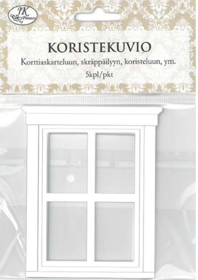 Koristekortti A6 Ikkuna. Koristekortti sopii A6-kokoisen korttipohjan päälle, jolloin korttipohja näkyy laserleikatun kuvion läpi.