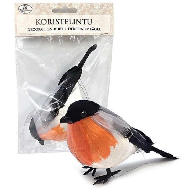 Pakkauksessa 1 punatulkku, punatulkun koko n. 13,5 x 7,5cm. Punatulkun jaloissa rautalangat kiinnittämistä varten.