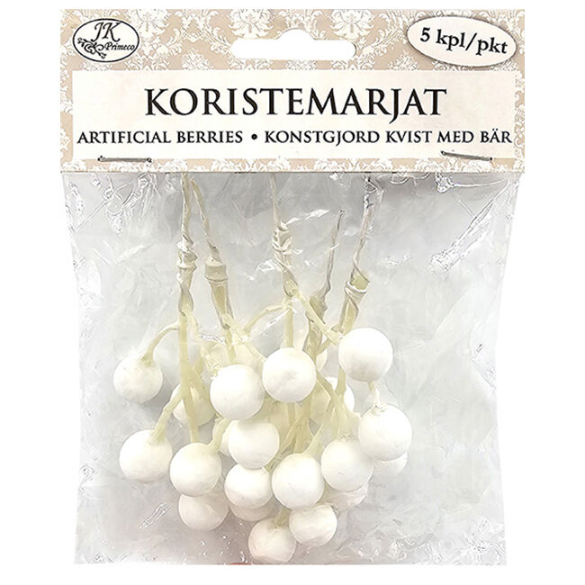 Koristemarjat askarteluun ja koristeluun. Pakkaus sisältää viisi kappaletta muovisia marjaoksia, joissa on rautalanka.