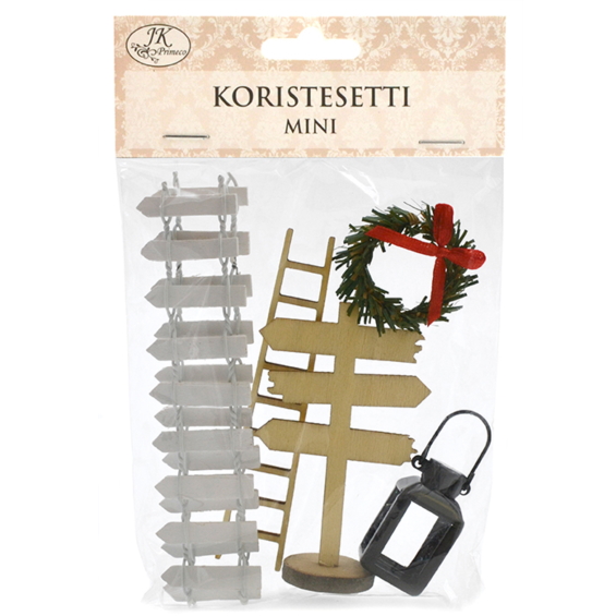 Setti sisältää kranssin, lyhdyn, tikapuut, aidan ja kyltin.