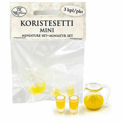 Koristesetti koristeluun ja minimaailman rakentamiseen. Pakkaus sisältää yhden muovisen juomakannun ja kaksi lasia.