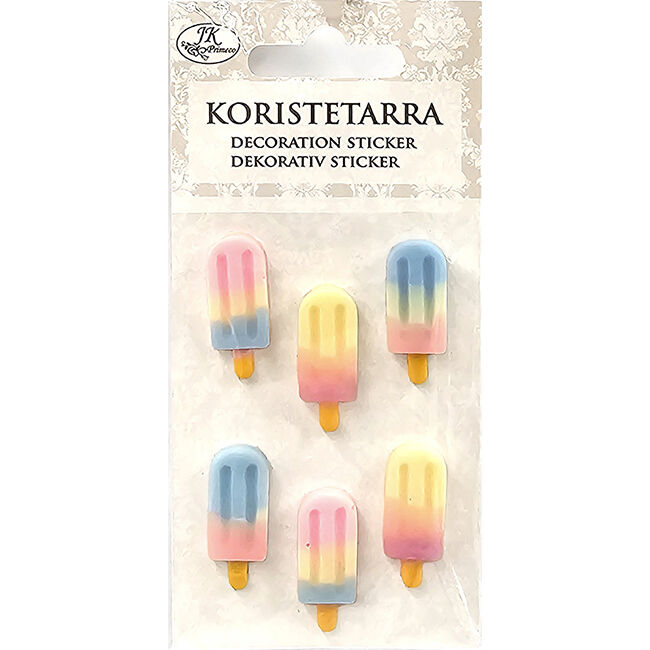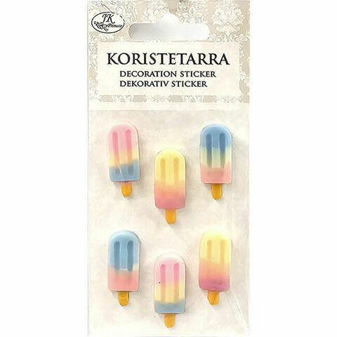Koristetarrat askarteluun ja koristeluun. Pakkaus sisältää kuusi kappaletta jäätelön muotoisia tarroja.