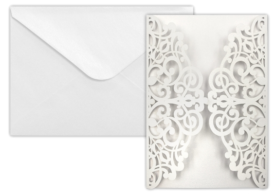 Keskeltä avautuva, laserleikattu helmiäiskorttipohja ja helmiäiskirjekuori askarteluun.