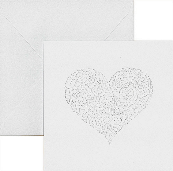 Neliönmallinen helmiäiskortti laserleikatulla sydänkuviolla. Pakkauksessa 5 korttia ja 5 kuorta.
