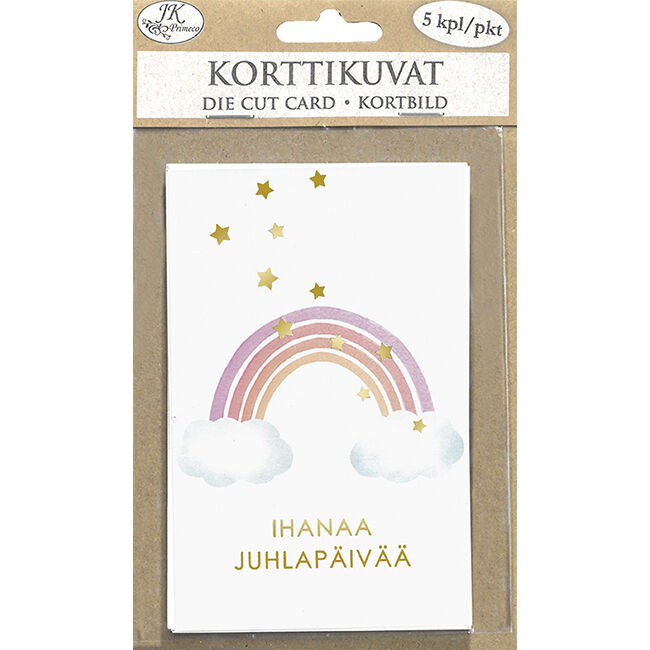 Korttikuvat askarteluun ja koristeluun. Pakkaus sisältää viisi kappaletta kartonkisia korttikuvia, joissa on kultainen foliopainatus.