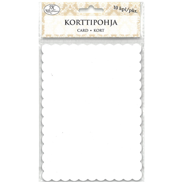 Korttipohja koristereunalla askarteluun ja koristeluun. Pakkaus sisältää 10 kpl yksiosaisia korttipohjia. Kortti mahtuu C6-kokoiseen kirjekuoreen.
