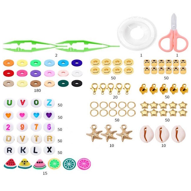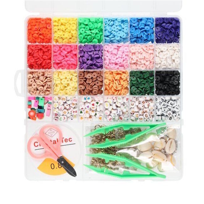 Monipuolinen koruaskartelusetti sisältää litteitä helmiä 18 eri värissä, kutakin väriä noin 180kpl, dia 6 mm. 150 kpl aakkos-, numero- ja sydänhelmiä (musta, kultainen, värikäs). Lisäksi sakset, 2 kpl pinsettejä ja naru 3 m. Askartelusetin sisältö mahdollistaa monenlaisten, juuri oman näköisten korujen tekemisen.