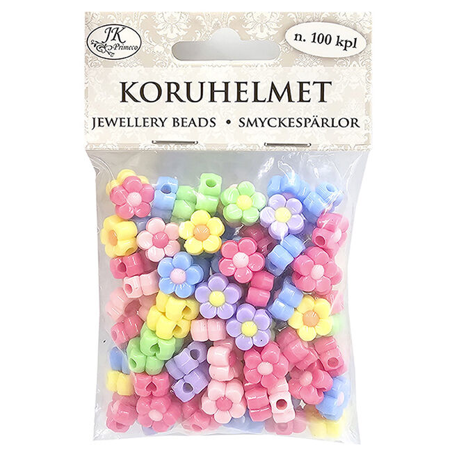Koruhelmet koruaskarteluun. Pakkaus sisältää 50g eli noin 100 kappaletta muovisia kukan muotoisia koruhelmiä useassa eri värissä.