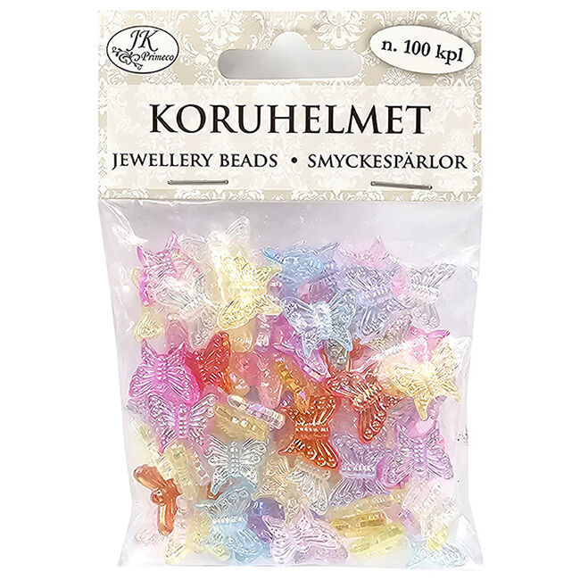 Koruhelmet koruaskarteluun. Pakkaus sisältää 33g eli noin 100 kappaletta muovisia perhosen muotoisia koruhelmiä useassa eri värissä.