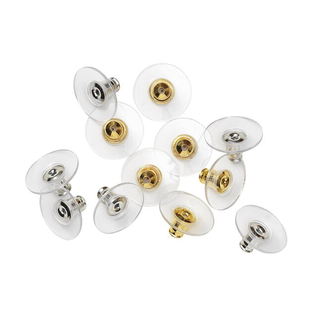 Korvakorujen stopparit, joissa on muovinen suoja korvanapeille. Täydellinen lisä, kun olet kadottanut stopparin. Mukavat käyttää muovisen suojan ansiosta. Pakkaus sisältää yhteensä 6 paria stoppareita, 3 paria hopeanvärisiä ja 3 paria kullanvärisiä.