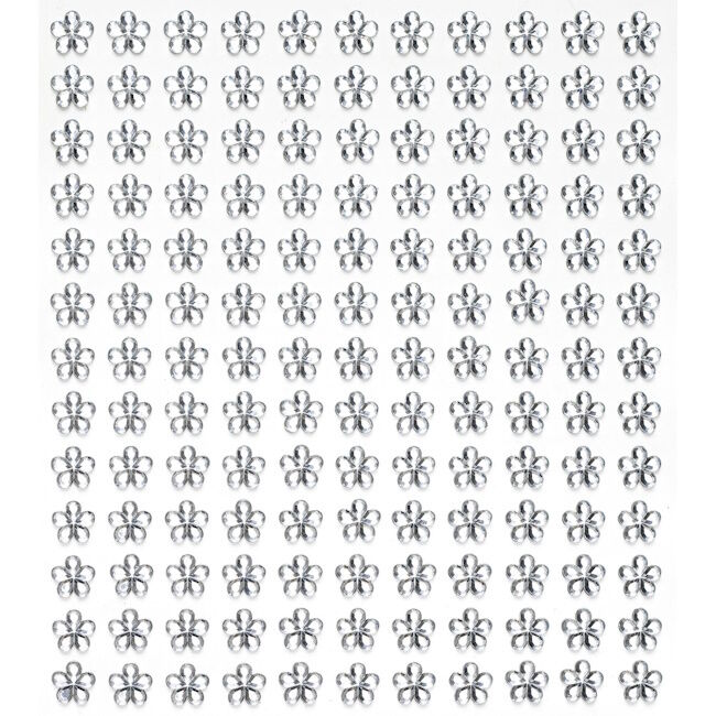 Kukan muotoisia strassikivitarroja. Jokainen kukka on Ø8 mm, yhteensä 288 läpinäkyvää/lasimaista tarraa, jotka ovat itsekiinnittyviä. Pakkaus sisältää 2 arkkia 12×13,5 cm ja helmet on valmistettu akryylistä. Strassikoriste sopii mainiosti myös koristeluun, korttien tekoon, scrapbookingiin, tee-se-itse ja askarteluun yleensä.