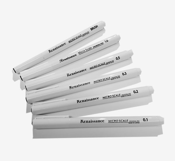 Kuitukärkikynä joissa 5 eri teränvahvuutta 0.1, 0.2, 0.3, 0.5 ja 1.0 sekä sivellinkärki.