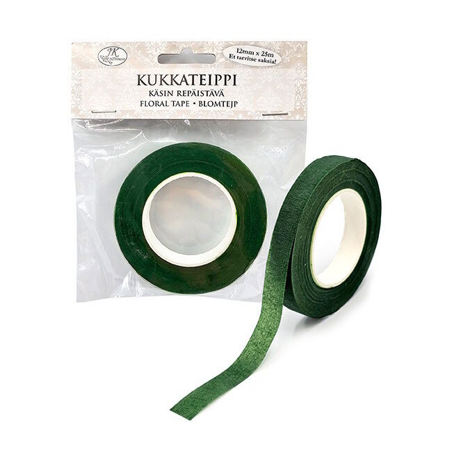 Pakkauksessa 1 rulla vahattua paperista kukkateippiä, rullan koko n. 12mm x 25m.