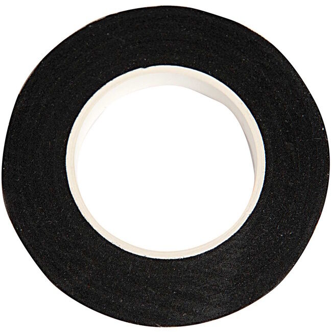 Kukkateippi, josta tulee liimautuvuus esiin teippiä vähän venyttämällä. Leveys 12 mm. Rullassa 27,5 m.