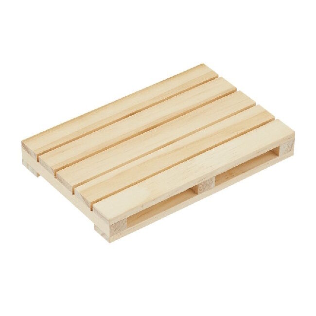 Miniatyyri kuormalava, koko noin 11,4 x 7,5 x 1,5 cm.
