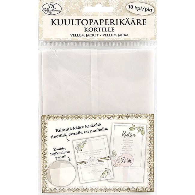 Kuultopaperikääre korttiaskarteluun. Pakkaus sisältää 10 kappaletta läpikuultavia kuultopaperikääreitä. Kuultopaperikääre on tyylikäs, elegantti ja sopii kauniisti kortin ympärille. Viimeistele kääreen kiinnitys sinetillä, tarralla tai nauhalla. Kuultopaperikääre sopii C6-kirjekuoreen.