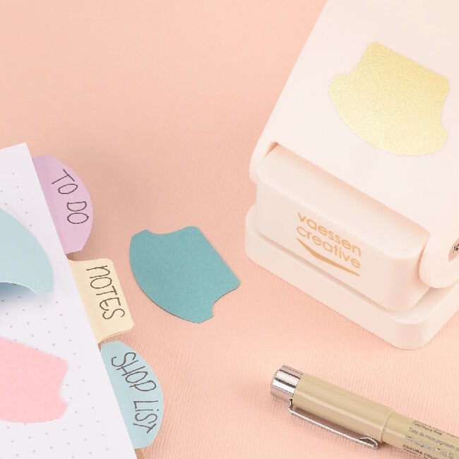 Luo pyöristetyt tabit muistikirjojen, esityslistan, päiväkirjojen ja leikekirja-albumien välilehdille raskaalla Journal Tab -lävitemellä. Voit tehdä sekä yksi- että kaksinkertaisia. Työnnä materiaali lävistimeen ja paina kahvaa lävistääksesi. Tuloksena on täydellisesti leikattu tabi, jonka voit kiinnittää muistikirjaasi, albumiin tai suunnittelijaan. Taita materiaali kaksoisliuskaa varten ja varmista, että taite on täydellisesti kielekkeen keskellä. Lukitse kahva käytön jälkeen säilyttääksesi rei'ityslaitteen turvallisesti.