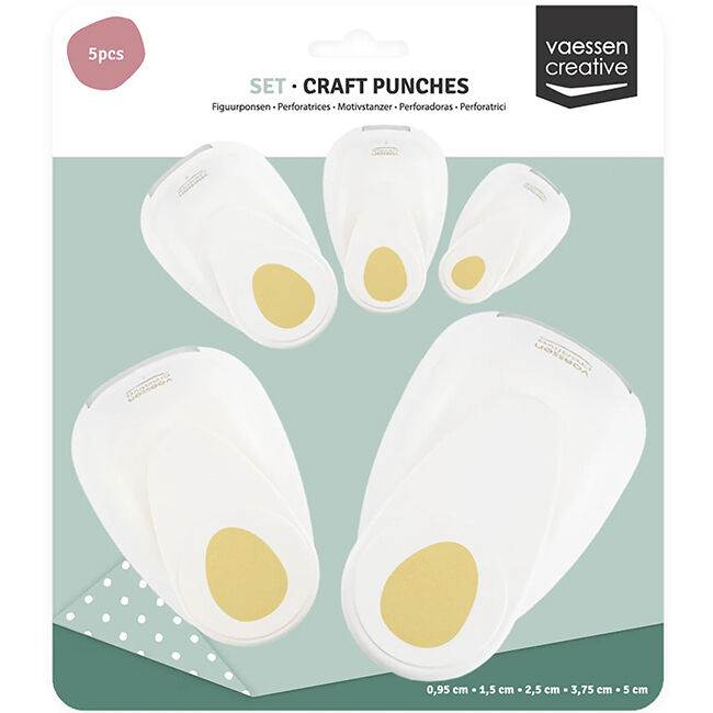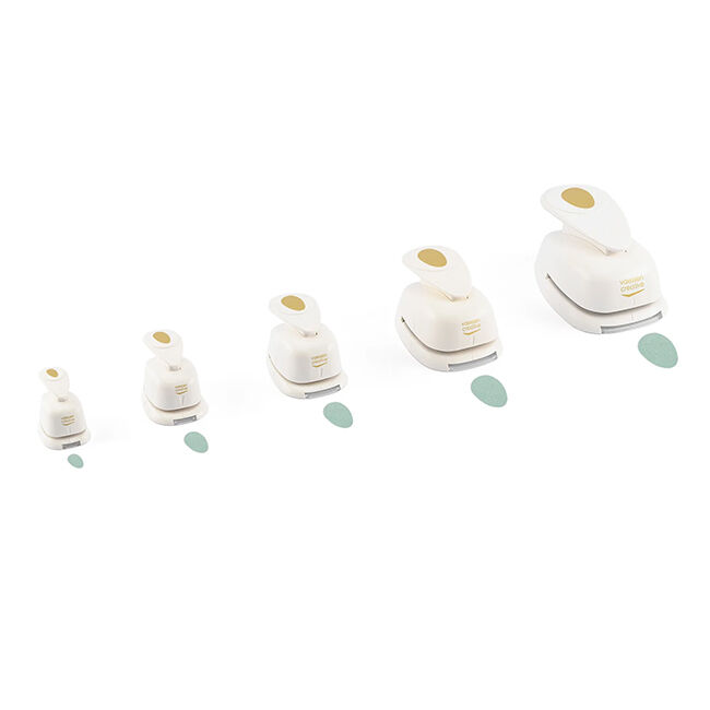 Tällä kuvioleikkurisetillä leikkaat munia (Ø 50, 37.5, 25, 15, ja 9.5 mm) paperista, kartongista, valokuvista, korkista, ohuesta vaahtomuovista ja muusta. Leikkurit ovat täydellisiä apuvälineitä korttien, scrapbooking-sivujen, suunnittelijoiden, etikettien ja kutsujen koristeluun.