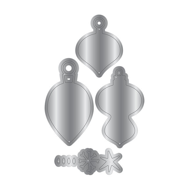 Sisältää neljä kuvioterää, joissa on kolme upeaa palloa ja yksi tähti, lumihiutale ja neljä pisaraa. Suurimman stanssin koko: 3,5 cm x 6,3 cm; pienimmän stanssin koko: 4,5 cm x 1,5 cm.