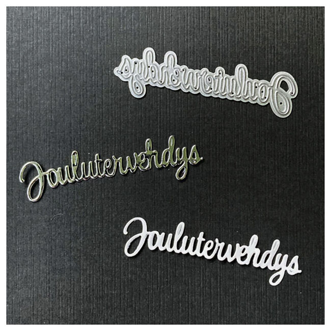 Yksi suomenkielinen tekstistanssi, ohutta metallia. Koko n. 7,7 x 2 cm.