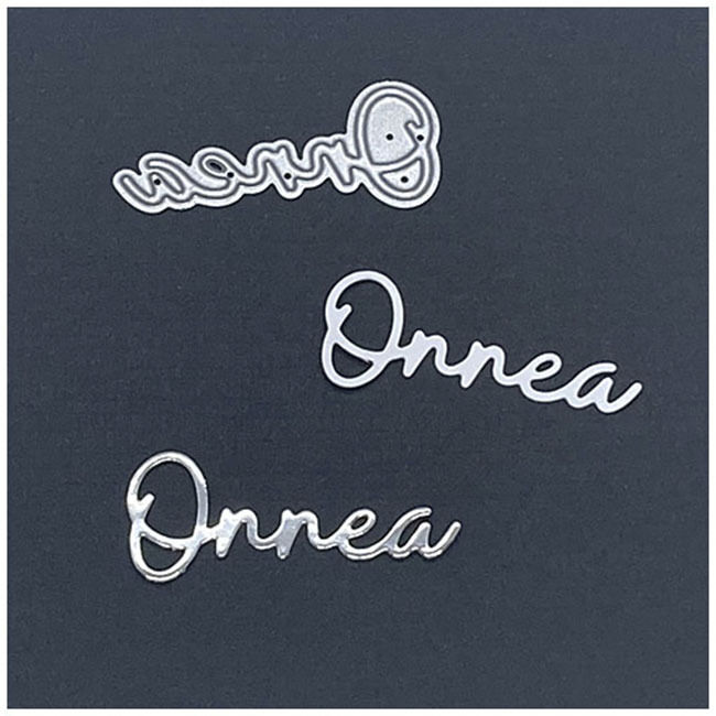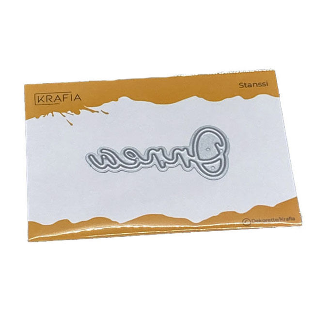 Yksi suomenkielinen tekstistanssi, ohutta metallia. Koko n. 4,7 x 2 cm.