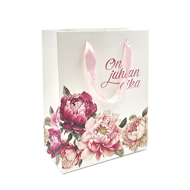Vahvalaatuinen lahjakassi paketointiin, käytettäväksi sellaisenaan tai koristeltuna. Lahjakassin pohjassa on vahvike. Lahjakassin kahva on satiininauhaa.