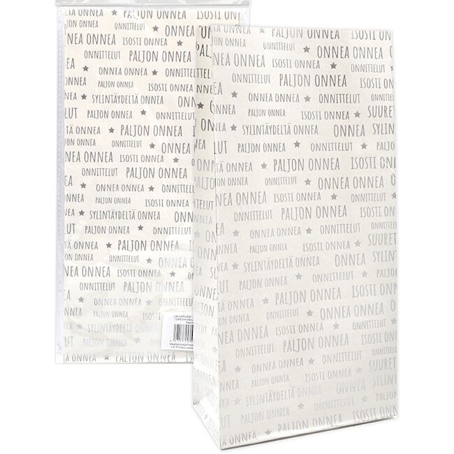 Lahjapussit paketointiin, käytettäväksi sellaisenaan tai koristeltuna. Pakkaus sisältää viisi kappaletta paperisia tasapohjapusseja, joissa on hopeinen foliopainatus.
