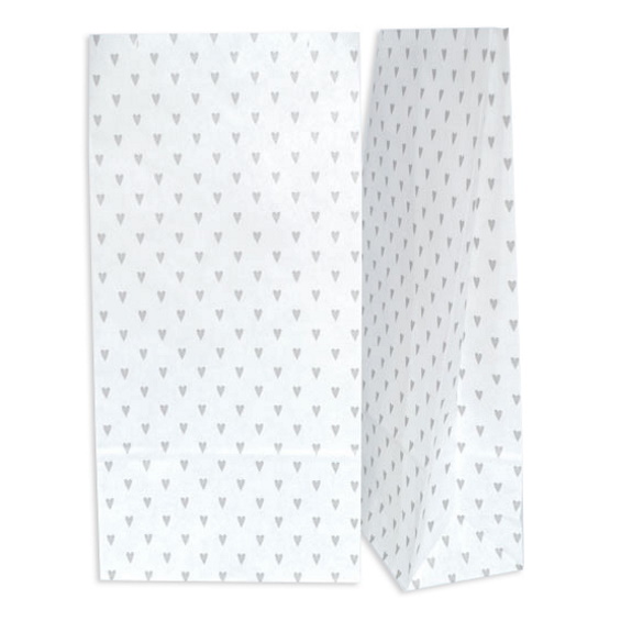 Valkoinen paperinen lahjapussi harmailla sydänkuviolla. Yhden pussin koko 28,5cm x 14cm x 7cm.