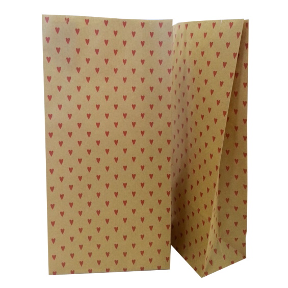 Paperinen uusiolahjapussi sydänkuvioilla. Yhden pussin koko 28,5cm x 14cm x 7cm.