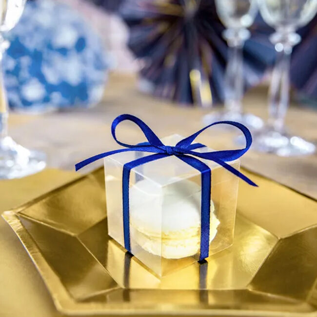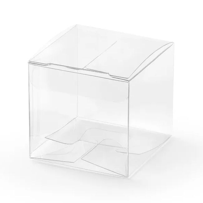 Kirkkaasta muovista valmistetut neliönmuotoiset laatikot sopivat erinomaisesti vieraslahjoiksi.