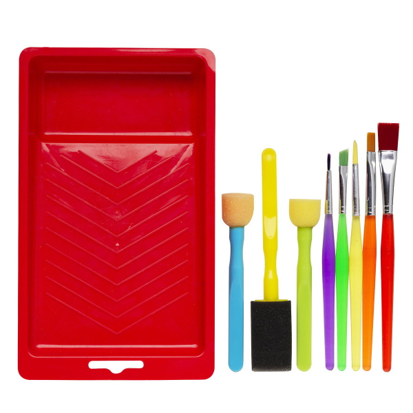 Värikkäät työkalut pienimmille, luovat lapset tarvitsevat luovia työkaluja! Tähän sarjaan olemme keränneet 5 sivellintä, 2 tuputinta ja 1 vaahtomuovisiveltimen sekä yhden pienen maalikaukalon (20x12x2,5 cm). Kaikki työkalut ovat 13-15 cm pitkiä ja nissä on kirkaan väriset hauskat varret. Siveltimet on varustettu metalliholkilla ja synteettisillä harjaksilla. Helppo pestä vedellä käytön jälkeen.
