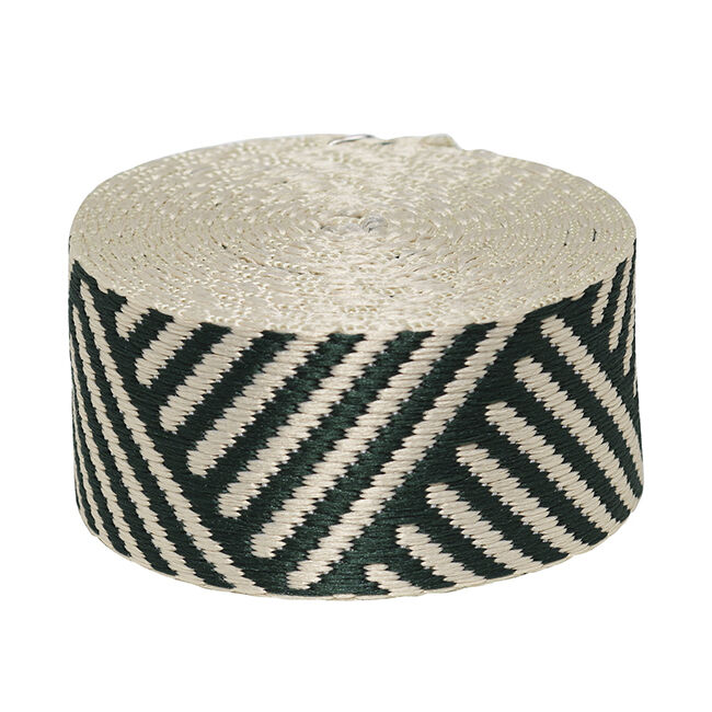 Beige laukun hihna, jossa on vino kudottu kuvio.