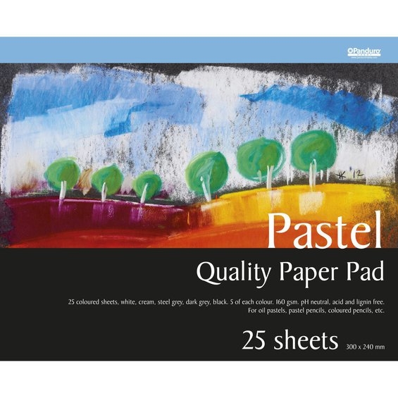 Pastellilehtiö. Öljypastelleille, kuiville pastelleille ja värillisille lyijykynille. 25 värillistä sivua (valkoinen, kerma, teräsharmaa, tummanharmaa, musta), 24x30 cm. Paino 160 g Happo ja ligniini vapaita.