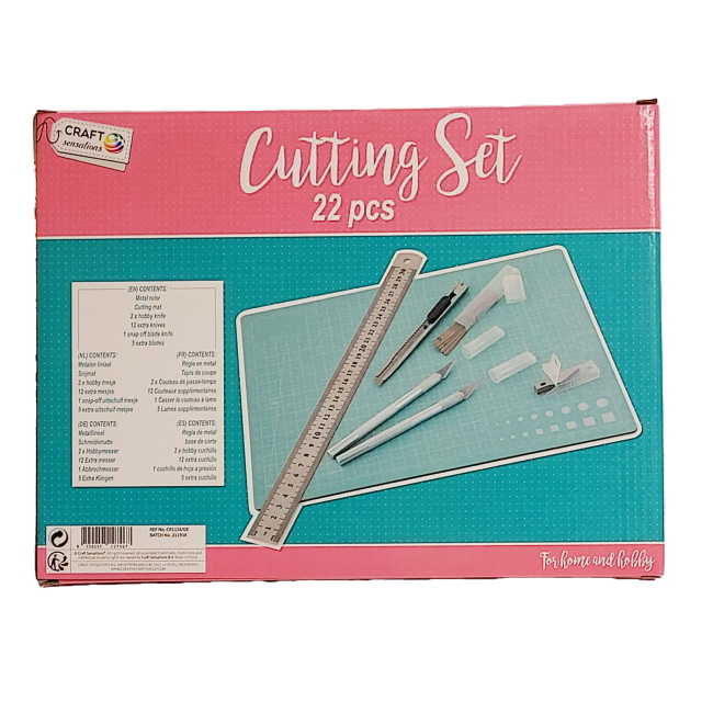 Pakkauksessa: 30cm metalliviivotin, A4 leikkuualusta, 2 askarteluveistä + 12 lisäterää, katkoteräveitsi + 5 lisäterää.