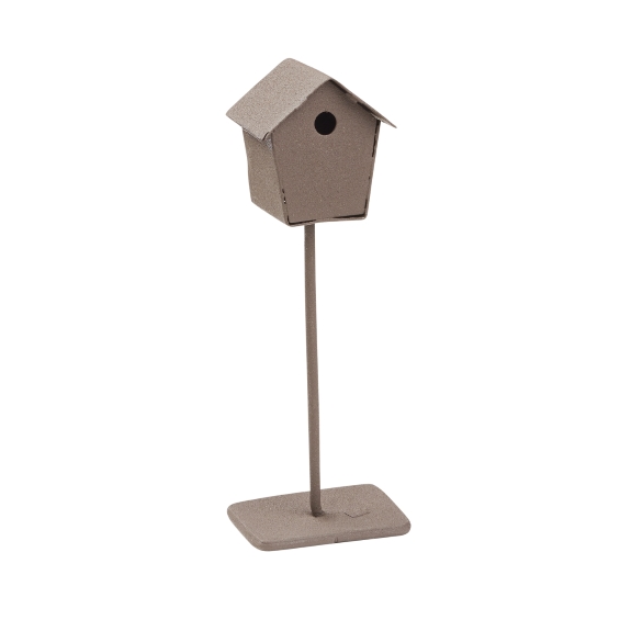 Metallinen linnunpönttö miniatyyripuutarhaan. Korkeus 10 cm.