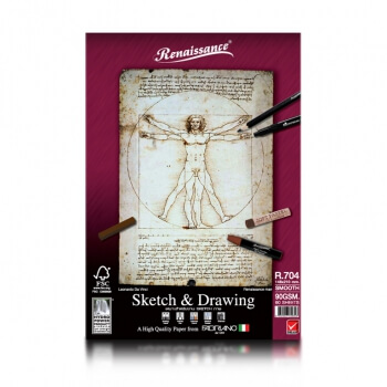 Renaissance luonnos- ja piirustuslehtiö sileäpintaisella luonnonvalkoisella paperilla (90 g). Laadukas italialainen paperi on happovapaata, FSC-sertifioitua ja valmistettu 100 % selluloosasta. Paperi säilyy pitkään, ei homehdu eikä kellastu.