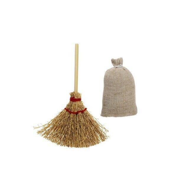 Puusta, kankaasta ja oljesta valmistettu luuta ja säkki tonttuille ja muille hahmoille. Korkeus 10 cm (luuta) tai 5,5 cm (säkki).