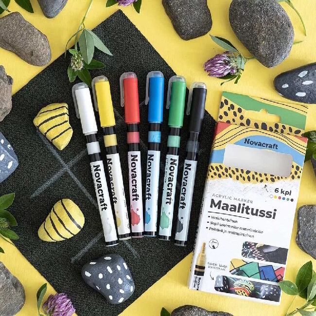 Maalitusseilla koristelet melkein mitä vain! Novacraft akryylipohjainen vesiohenteinen maalitussi - Acrylic Marker. Maalitussit sopivat useimmille materiaaleille mm. paperille, pahville, maalauspohjille, puulle, tekstiileille, kivelle, useimmille muoveille, metallille, lasille ja keramiikalle.