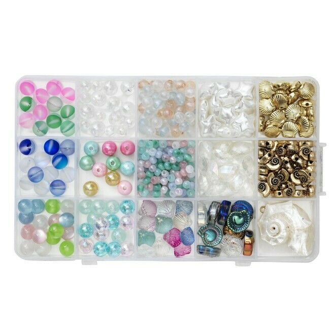 Helmisekoitus, jossa on villi ja kaunis valikoima merestä inspiroituneita helmiä! Suuria ja pieniä muovi-, metalli- ja lasihelmiä (Ø4-11 mm), kauniissa sinisen ja vihreän sävyissä sekä eri läpinäkyvyysasteissa. Lisäksi pieniä, kullanhohtoisia simpukkahelmiä, hieman suurempia, metallinhohtoisia simpukankuoria ja kauniita tähtiä, jotka muistuttavat makeanveden helmiä. Ja kruununa – suuri, aito ja kaunis simpukka, josta tulee riipus, joka todella nostaa korusi arvoa. Yhteensä 15 lokeroa, joissa on kauniita helmiä, jotka ovat jokaisen merenneidon toivelistalla! Kaikissa helmissä on 1 mm:n reikä.