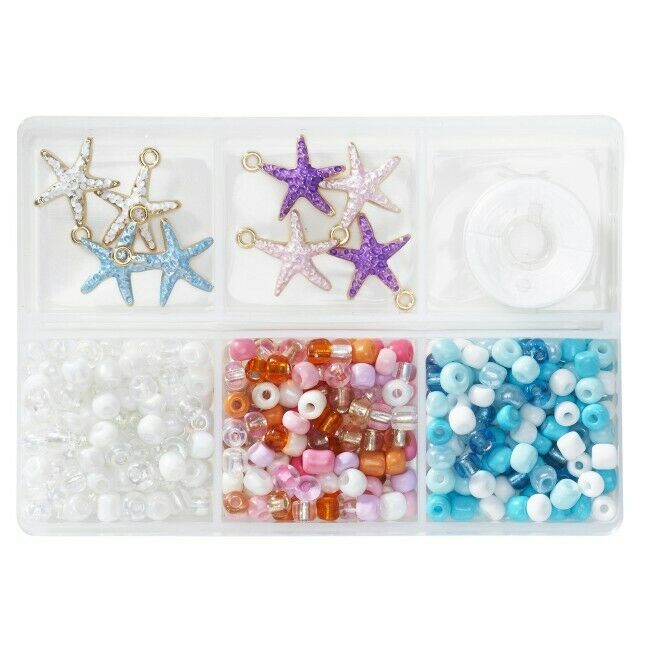 Rannekorusetti ihanalla kesä- ja rantatunnelmalla! Pakkaus sisältää pieniä, pyöreitä rocaille-lasihelmiä, joiden halkaisija on 4 mm ja joiden pituus vaihtelee leikkisästi hieman, jotkut ovat 3 mm pitkiä, toiset 5 mm. Helmiä on useissa eri väreissä, läpinäkyvyydessä ja kiillossa. Mukana on myös 8 kaunista meritähden muotoista riipusta, kooltaan 15 × 15 mm. Valmistettu metallista. Mukana on myös 5 metriä elastista nailonlankaa.
